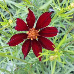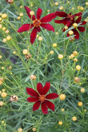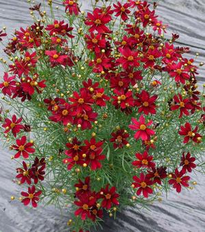 Tightly mounded habit with dark, fine threadleaf foliage. Summer blooms are a deep red satin shade that is irresistible to the sight and touch! Very extended bloom time.