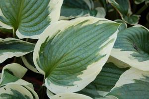 The white, irregular white edge of this dark green hosta makes the plant almost glow in the shade garden.