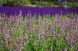 Lavender flowers on loosely formed spires soar above the glossy mounds of foliage.