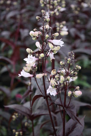 This is an IMPROVED selection of 'Husker Red' that was discovered here at Hoffie Nursery, Inc. in 2007. Since this exciting discovery, we have been trialing this treasure and building stock for production. We are very proud to offer this improved selection to the plant world, to be appreciated as we do. Foliage is a much deeper and a more intense maroon/purple shade. Besides the improved foliage color, the shorter height of 22-26" is what caught our eye. After years of vegetative propagation, we have also been impressed with the consistency of this selection. The overall performance of 'Husker Red' IMPROVED has proven to be far superior to other Penstemon varieties in our containers and trial gardens. White blooms add dramatic contrast in the summer.