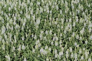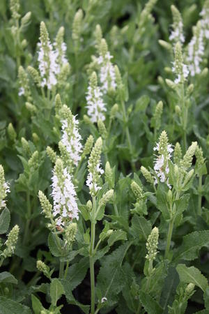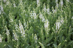 White flower spikes bloom in the summer months to add a cool feeling to the garden. Foliage is fragrant, gray-green.