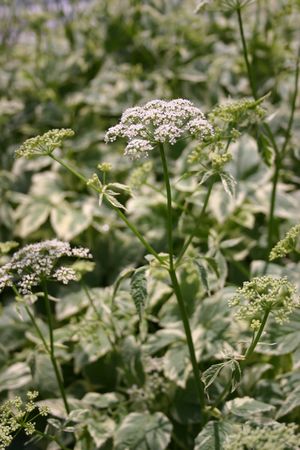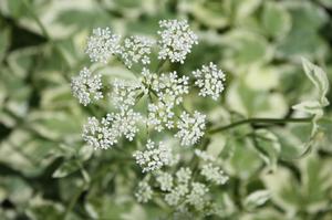 White flowers with variegated green and white foliage. Great for large areas or where nothing else will grow.