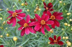 Tightly mounded habit with dark, fine threadleaf foliage. Summer blooms are a deep red satin shade that is irresistible to the sight and touch! Very extended bloom time.