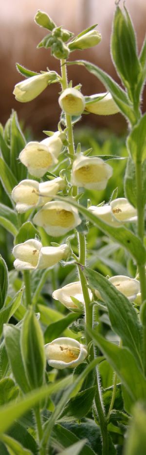 Tubular yellow flowers with brown netting on the inside. This is a perennial variety of Digitalis.